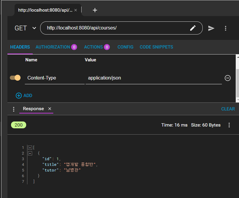실행 후 http://localhost:8080/api/courses 접속 또는 ARC 로 확인> 아래 화면처럼 API 확인가능